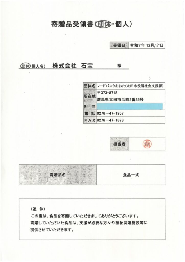 地域貢献活動の一環として、フードバンクおおた様へ食品の寄贈を行いました。